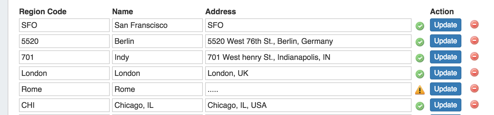 Valid addresses (according to Google's API) will show a green check mark next to the address field, invalid addresses (unable to be mapped) will show a yellow exclamation mark.