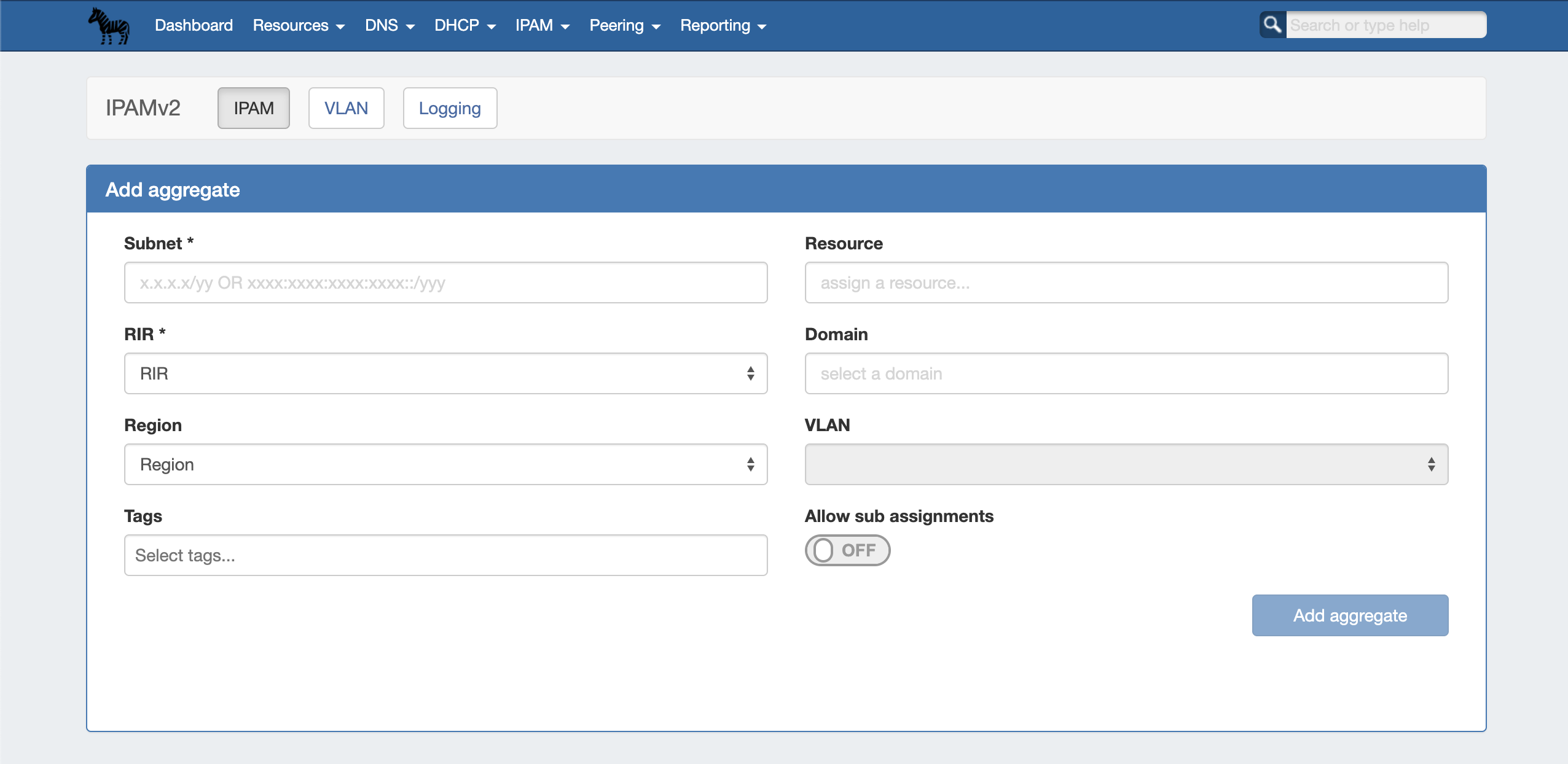 - To assign at manual aggregate creation, just select a resource from the dropdown in the IPAM Tab - Create Aggregate dropdown. See: Working with IP Aggregates.
