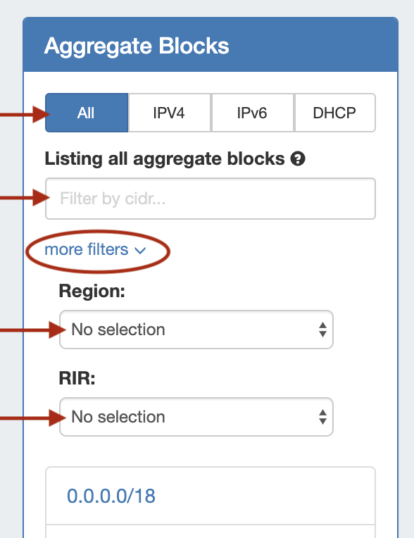 Search / Filter AggregatesSearch for and filter IPAM Aggregates from the Aggregate Blocks List: