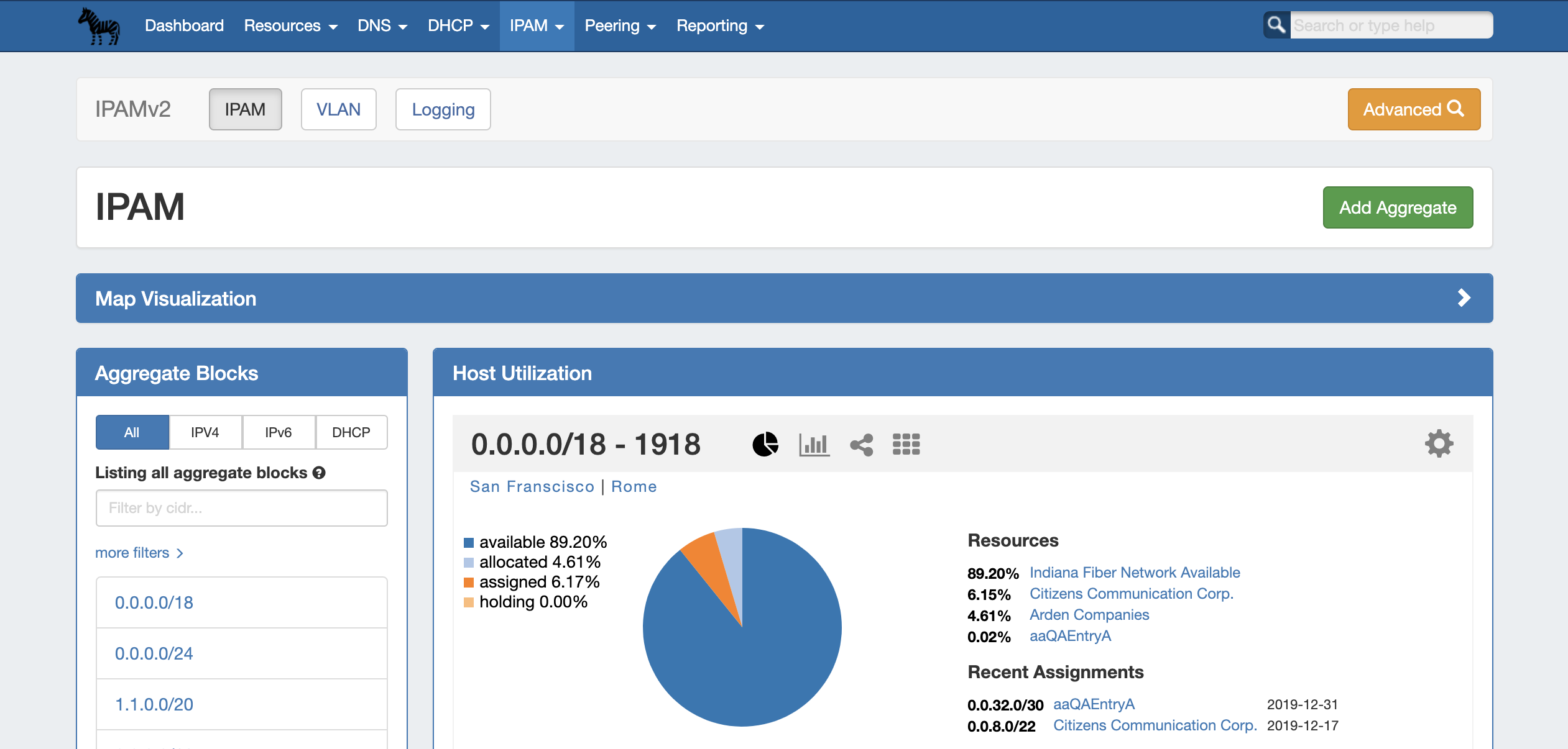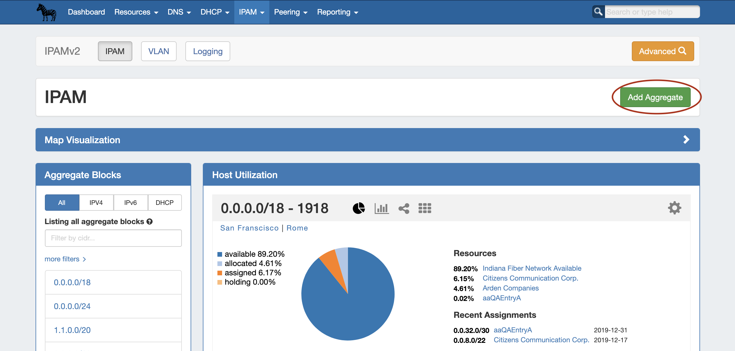When done, click "Add Aggregate". The IPAM Tab home page will automatically load, and the new aggregate will be listed under the Host Utilization and Aggregate Blocks list of the IPAM Tab for further management.