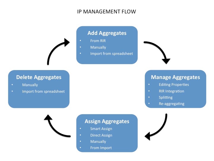 IP Management is comprised of four basic functions: adding aggregates into ProVision, managing those aggregate blocks, assigning them to a resource, and deleting the aggregates.