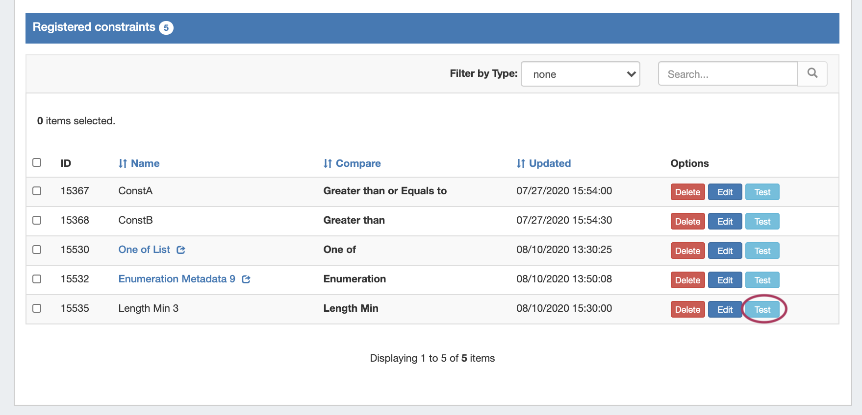 The test constraint form will appear - enter a test value, and you can check whether the constraint returns an appropriate invalid or valid response: