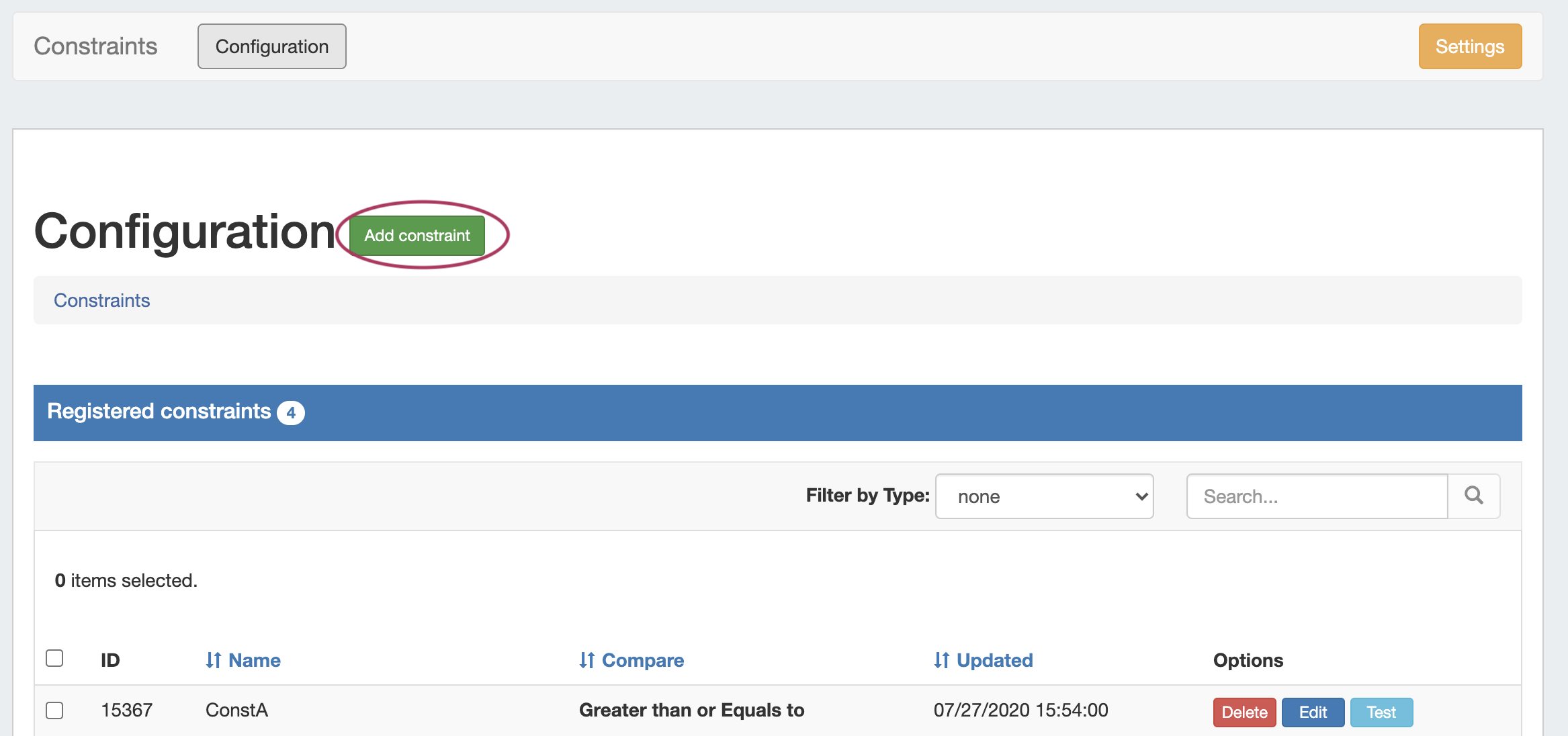 The Constraints Tab has one sub-tab - Configuration - where new constraints may be created and managed.