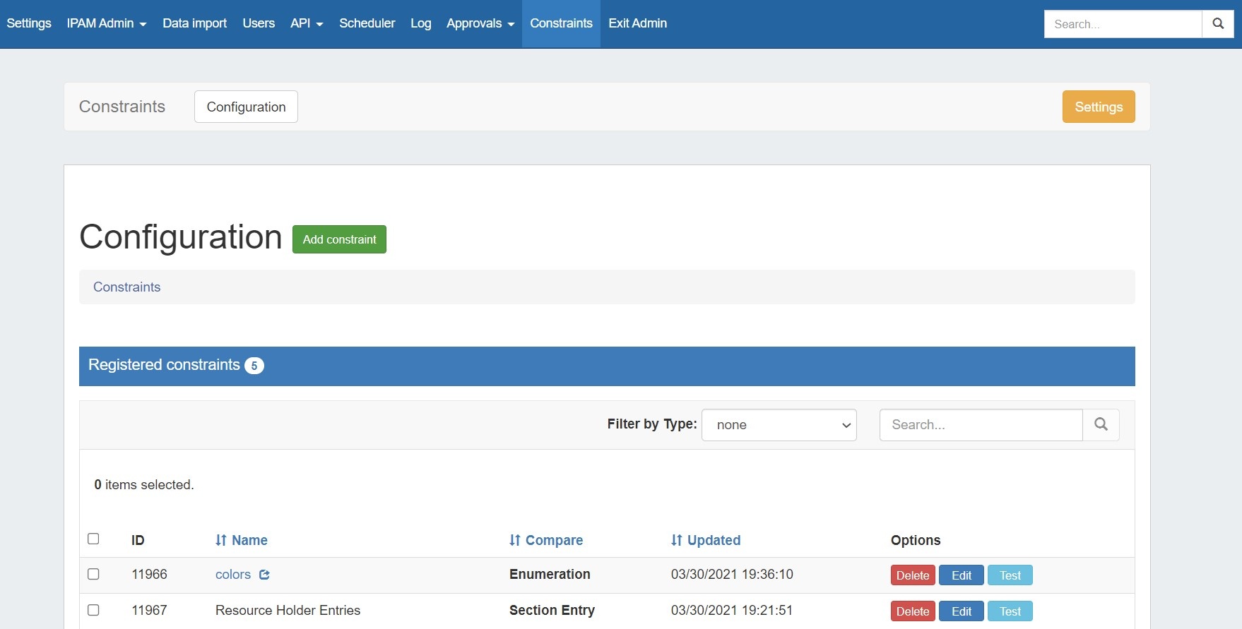 The Constraints system allows Admin users to configure custom field validation and limitations into IPAM fields. Many constraint types are available, such as mathematical comparison operators, length, enumeration, pre-set lists, RegEx, IPv4/IPv6, Phone, email, hostname, FQDN, Mac Address, and URL.