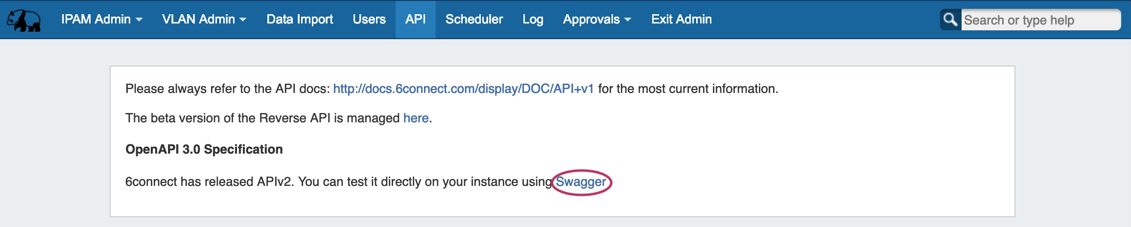 3. Under "OpenAPI 3.0 Specification" click the Swagger link providedthe API dropdown menu, click the Swagger link provided. You may also click on the "APIv2 Swagger Documentation" link provided under the APIv2 section of the page.