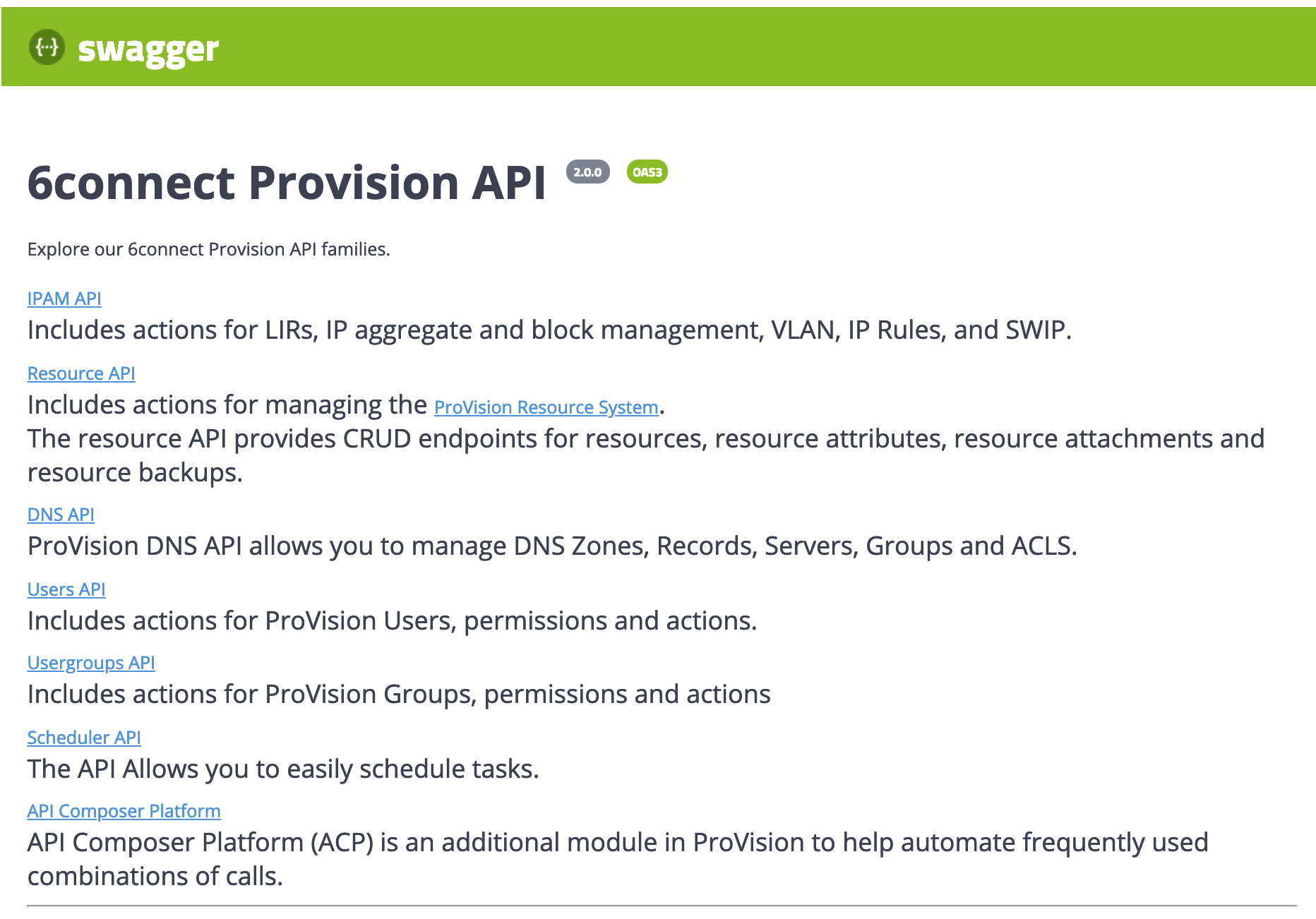 1. On the Provision the API Swagger home page, click on the name link for the API family that you wish to browse (IPAM, Resource, DNS, etc).