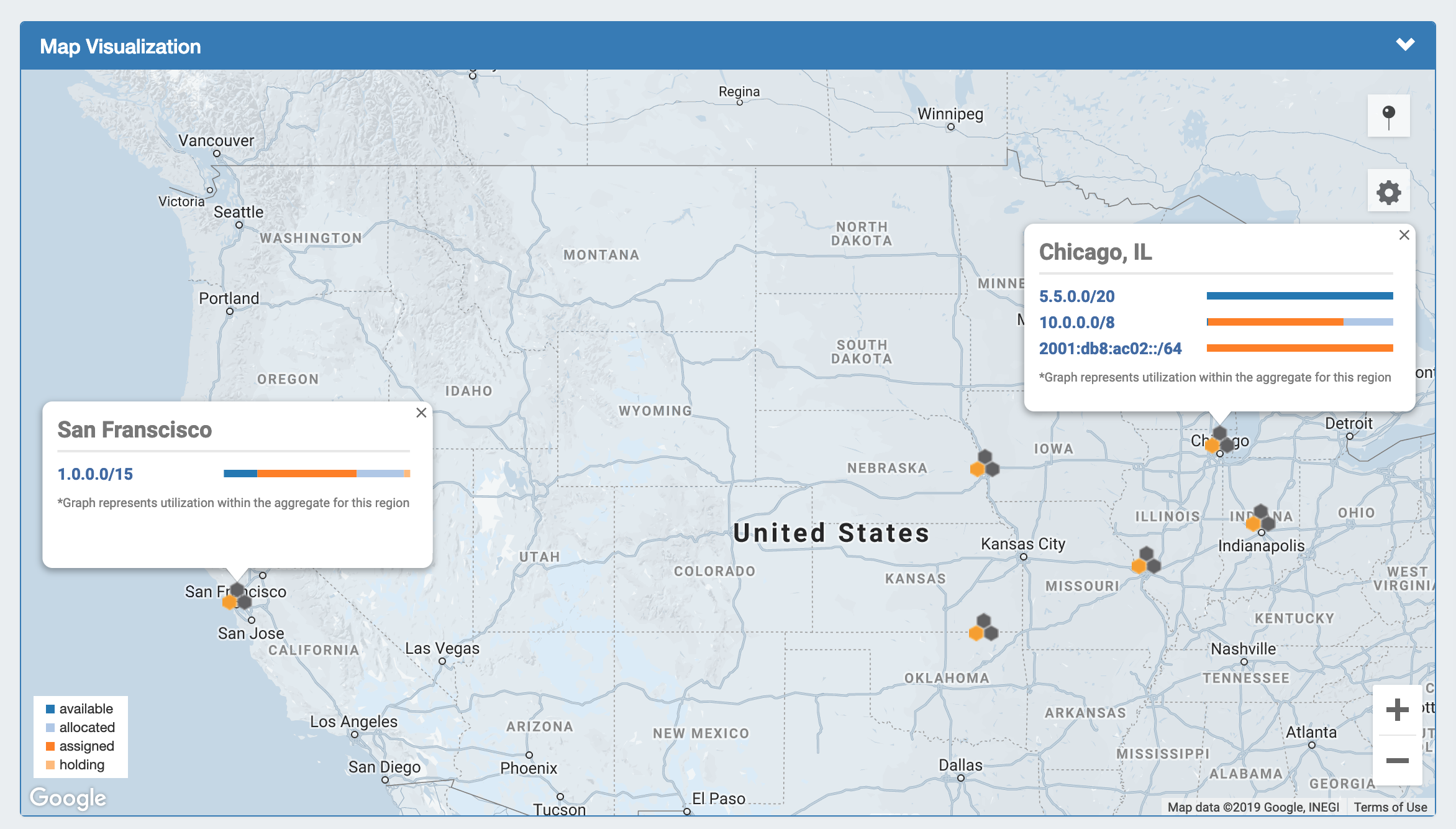 Map View shows aggregate locations / recent assignments in geographical format, based on the region assigned to those aggregates. Clicking on a location icon will bring up a current utilization graph and a link to that aggregate's IPAM Manage page if in Aggregates view, or recent assignment details if in Recent Assignments view.