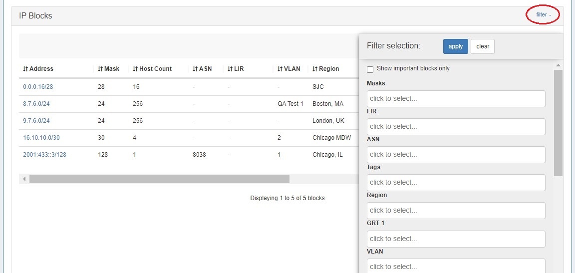 View, search, filter, and sort Assigned Blocks for the resource via the "IP Blocks" list