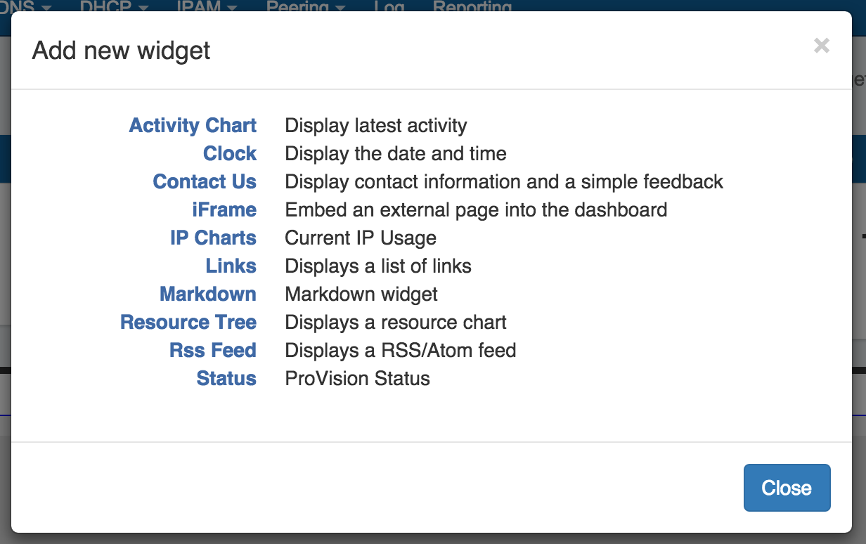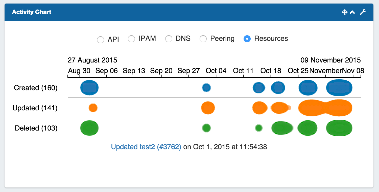 Illustrates activity level for API, IPAM, DNS, Peering, and Resource areas of ProVision. The Activity Chart is only visible to Admin users. Only one Activity Chart Widget may exist on a dashboard.