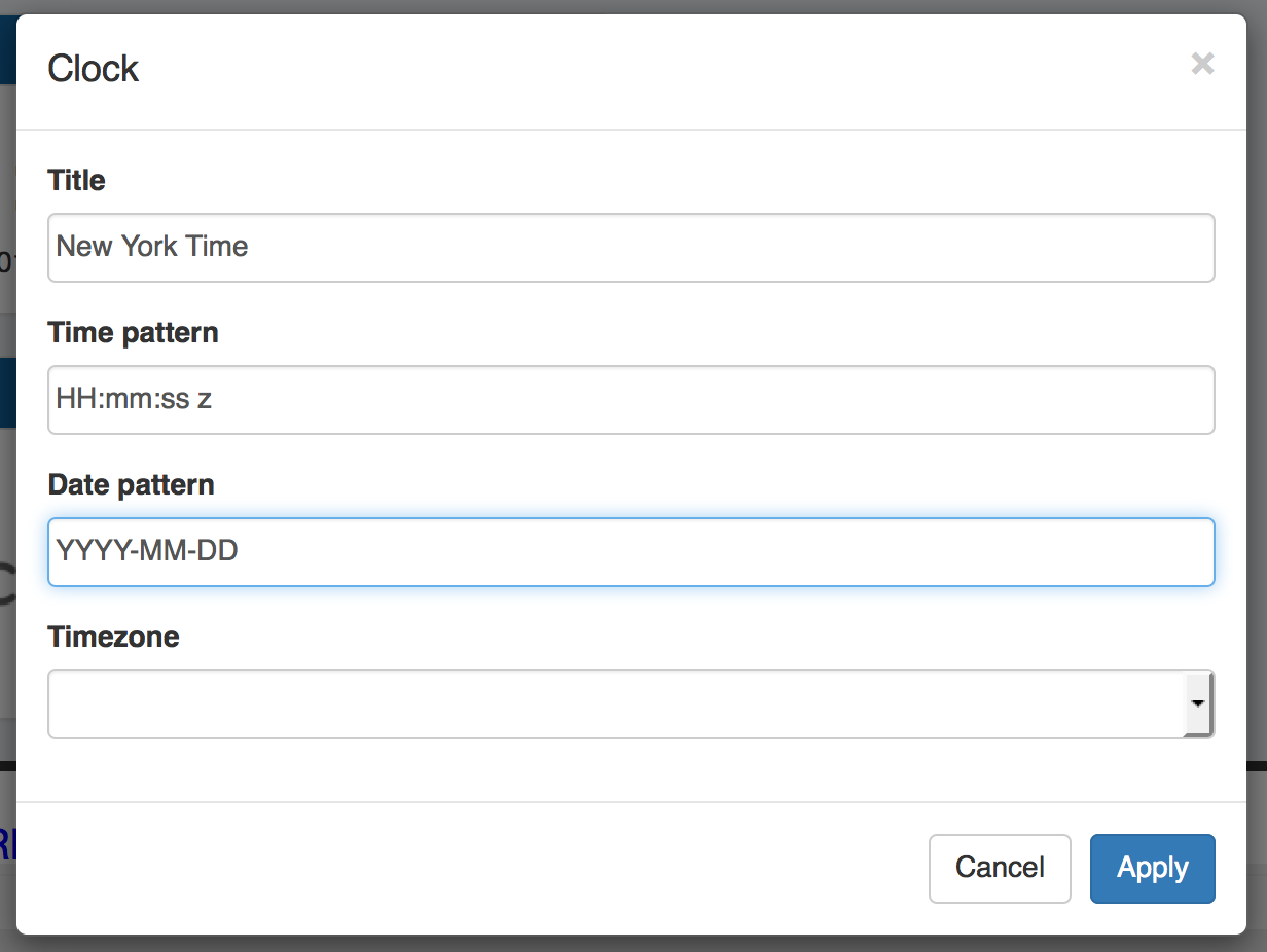 Time Pattern: Sets the desired format for the current time. Example: "HH:mm:ss z" shows hours, then minutes, then seconds, then time zone.