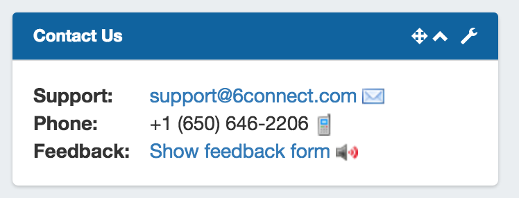 Provides support email, phone, and feedback form information. Only one Contact Us Widget may exist on a dashboard.