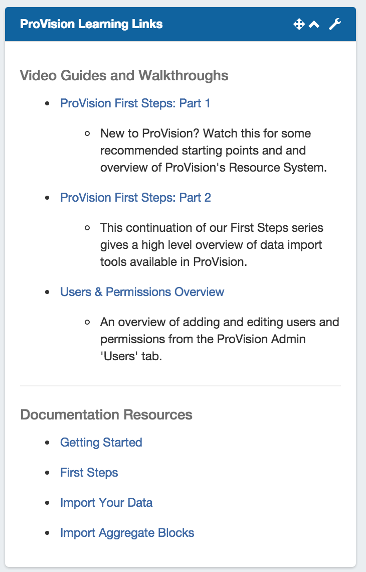 Provides a list of website links. Multiple Links Widgets may exist on a dashboard.