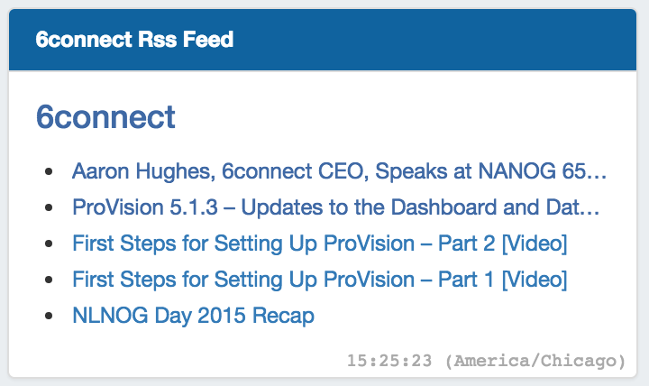Shows the most recent five entries of a selected RSS Feed. Feed links open in a new window when clicked.
