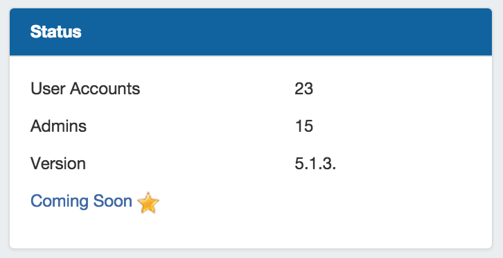 Shows ProVision status information, including number of user accounts (admin only), number of admin accounts (admin only), current version number, and a link to the "Coming Soon" section of the ProVision documentation.
