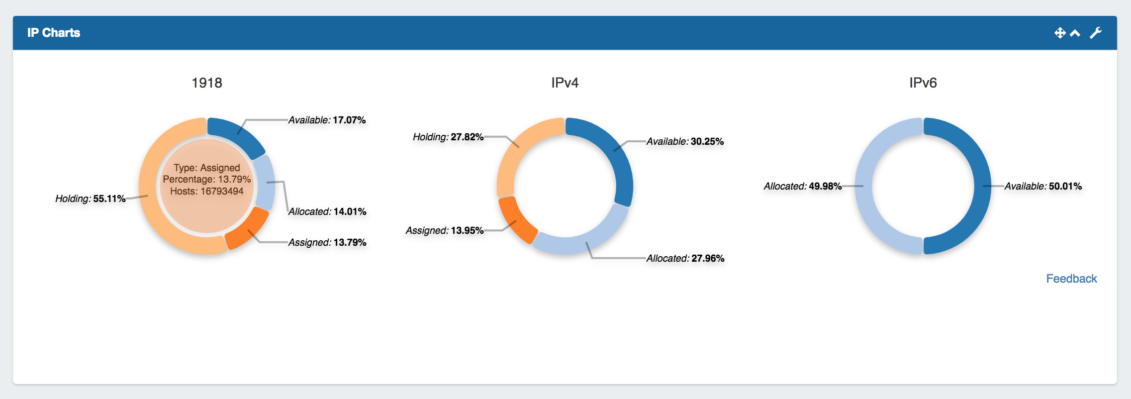 Illustrates the percentage of assigned, unassigned, allocated, and holding tank hosts for 1918 / IPv4 / IPv6 space out of the total available hosts in ProVision viewable by the user.