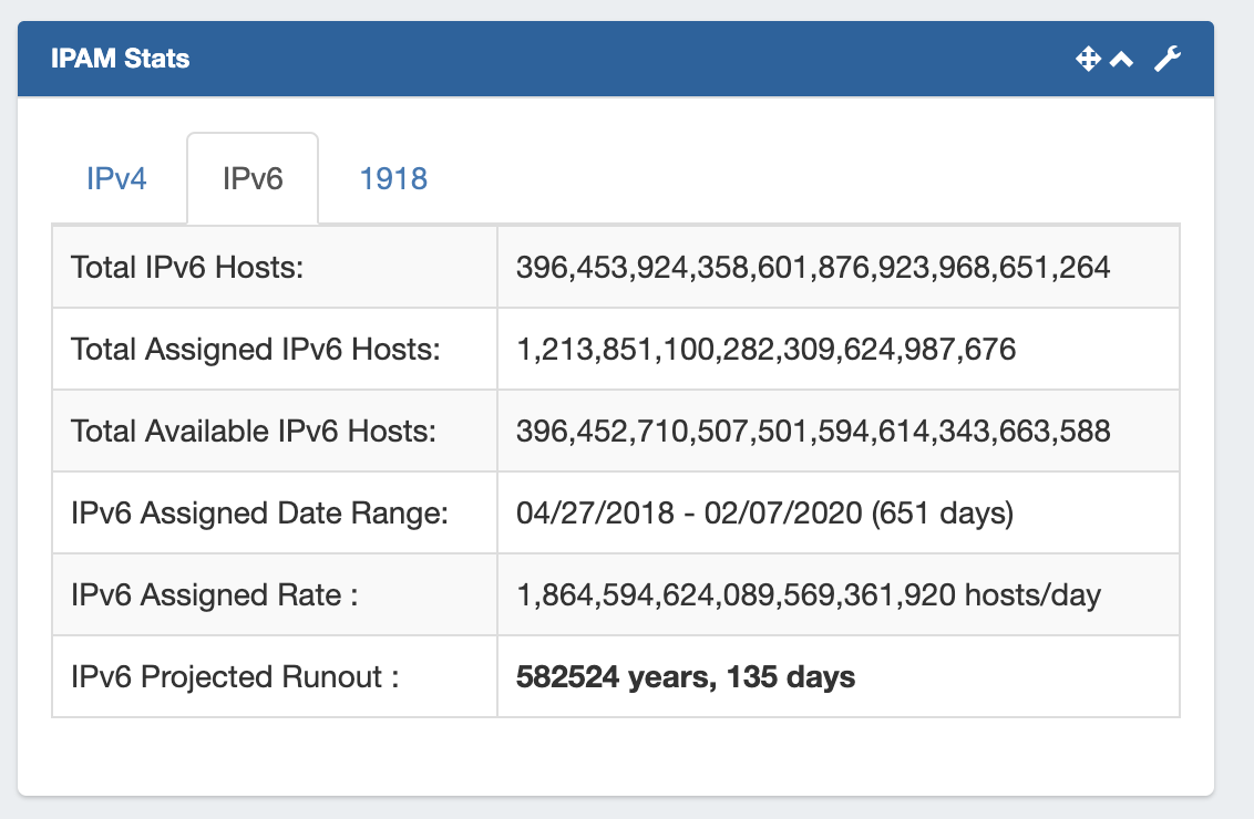 Users may select to view IPv4, IPv6, or 1918 stats by clicking on the tab for the block type you wish to view.