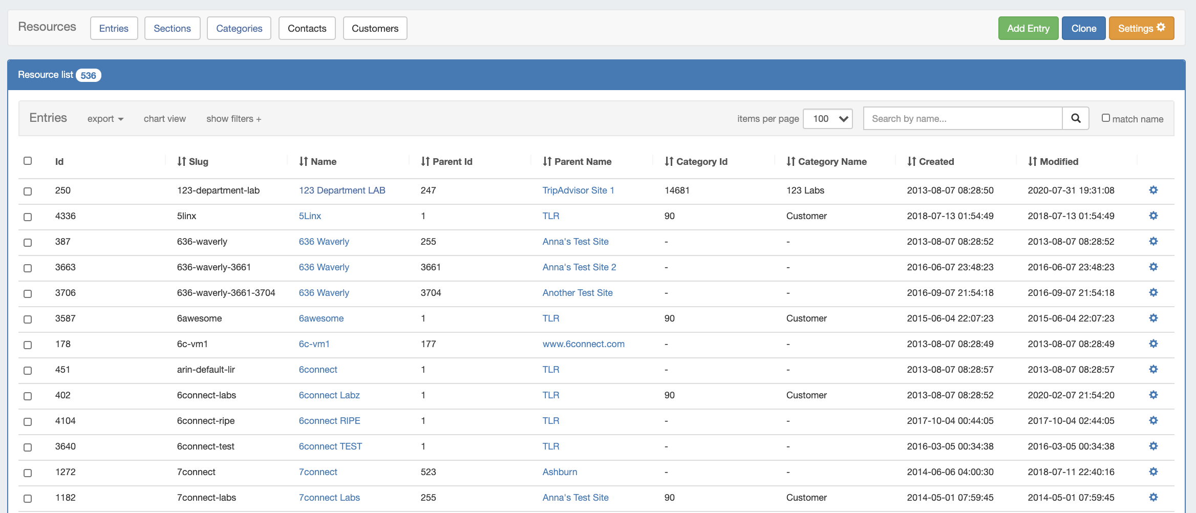 Note: The attribute name is the system slug designation for the attribute, not the display name shown in column headers or field labels. Slugs are unique ids entirely in lower-case lettering, and use dashes or underscores instead of spaces. To find the attribute slug, go to the Edit Section page, and look for either of the following areas for the desired field: 1) Click on the field name label (here: "Hostname") for a field that has already been added to the section, to open the field details information box: The field attribute slug will be listed under "Slug" - here, the slug for "Hostname" would be "6c-network-fqdn" 2) If the field has not yet been added to the section, you may view the field name with field slug after it, in parentheses, in the "Add Existing Fields" selection box: Here, the slug displayed for "2nd Email" is "6c-contact-email2". Once the attribute name and value has been entered as filter conditions, it should look like this: The resulting view list will then display only the resources with "QA1.6connect.com." entered for the Hostname (6c-network-fqdn) field: Encrypted attributes, such as "Password" and "Encrypted Data", can be searched via the Attribute Name filter. But users may not filter encrypted attributes by a specific attribute value. These attributes are designated as "encrypted" in the Attribute Name filter dropdown. The Attribute Value filter is disabled when an encrypted attribute name is selected. |