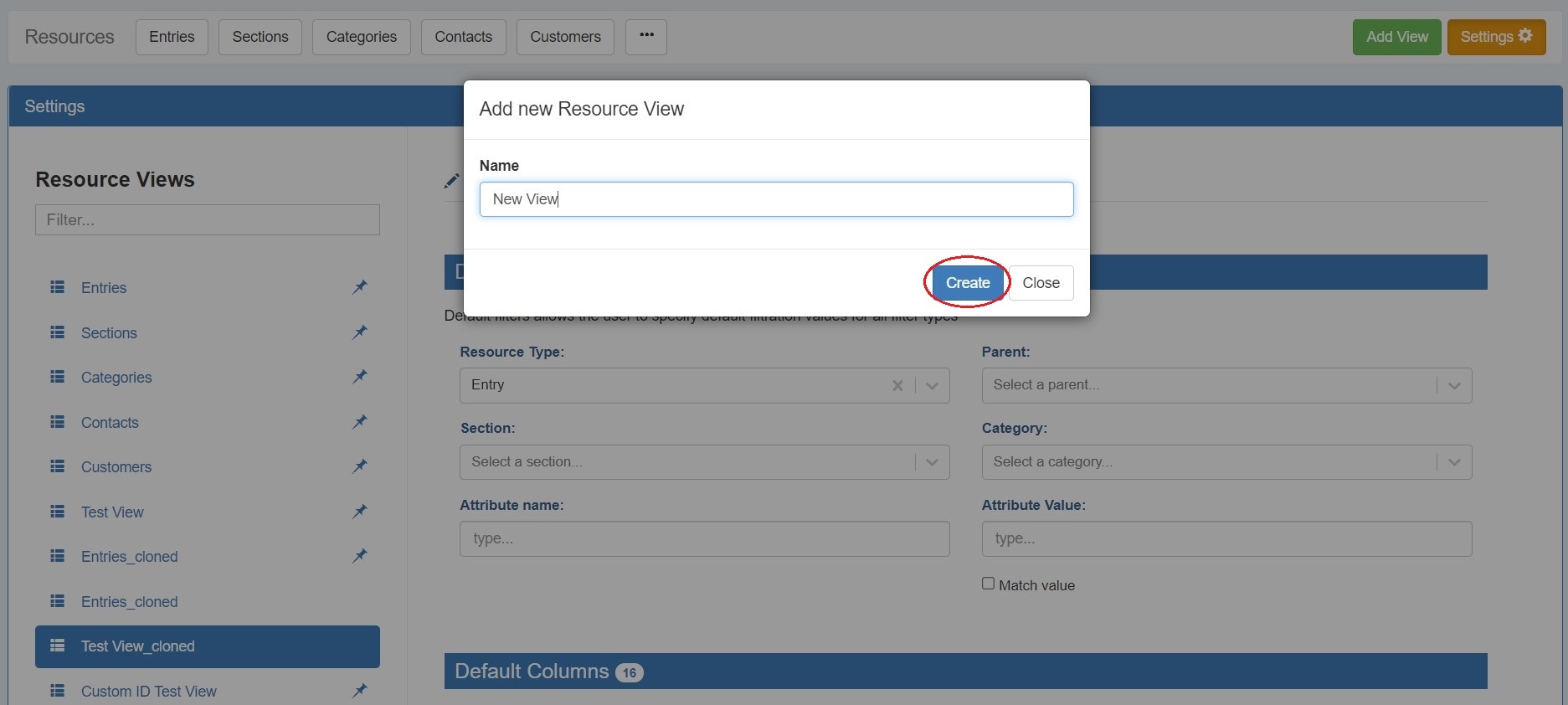 Create a new view by specifying a name. Then hit the "Create" button. The new view will be added to the view list, with no default filters applied and standard default columns enabled.