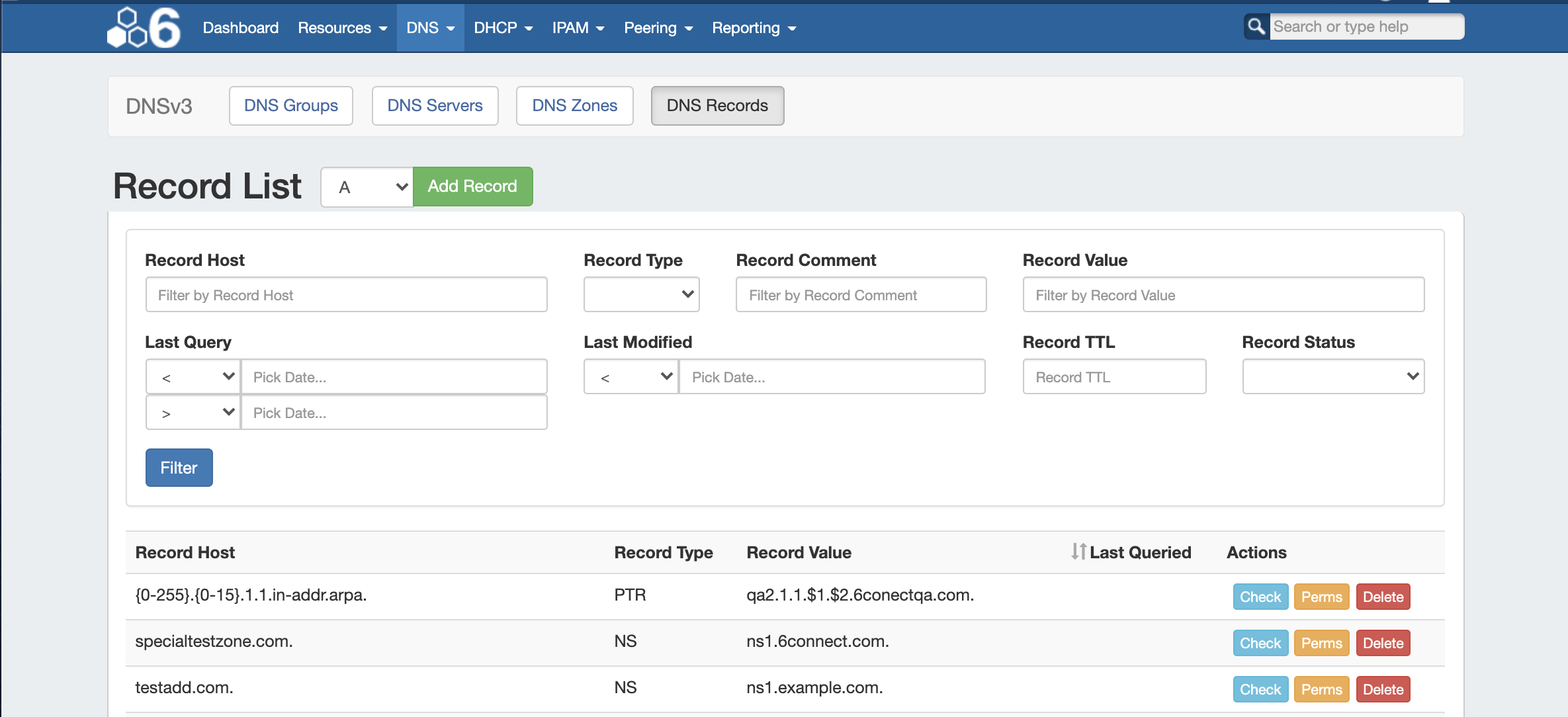 The DNS Records sub-tab provides a global list records for expedited searching, filtering, adding, and editing of DNS Records.