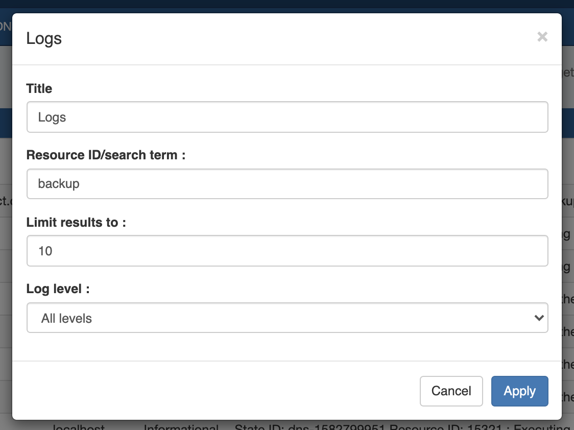The Logs Dashboard Widget displays the most recent 'x' number of logs for a specified search term, such as resource name, task, id number, username, and so forth.
