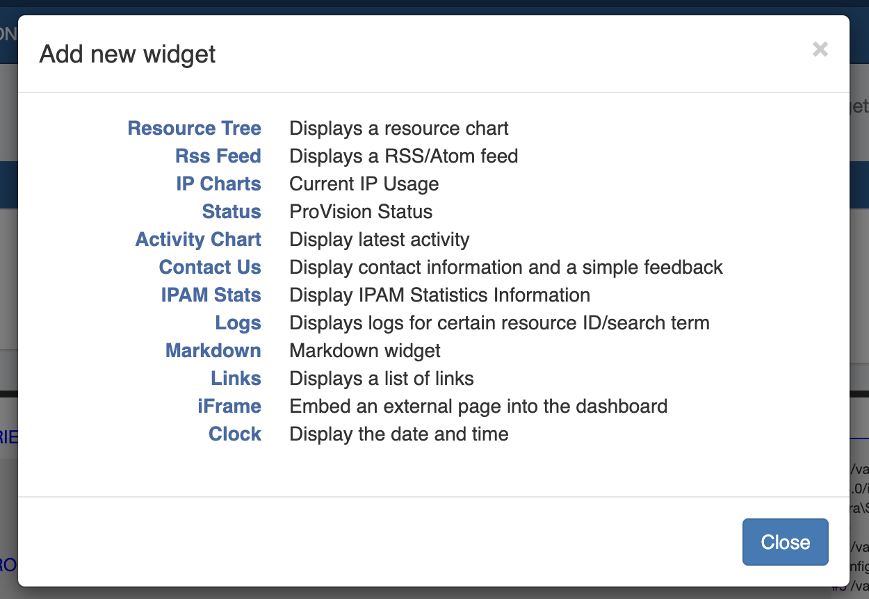 Some Widgets may only have one instance per dashboard, whereas other Widgets may be able to have multiple instances per dashboard. The Add New Widget dialog will only show you the widgets you have available to add.