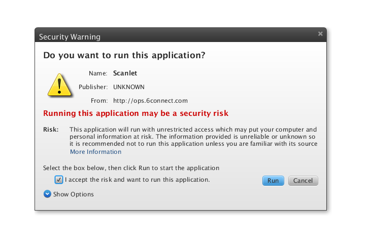 When you open the download URL, you should see the Java plugin activate and should be prompted with a security warning to confirm that you are knowingly running the application.