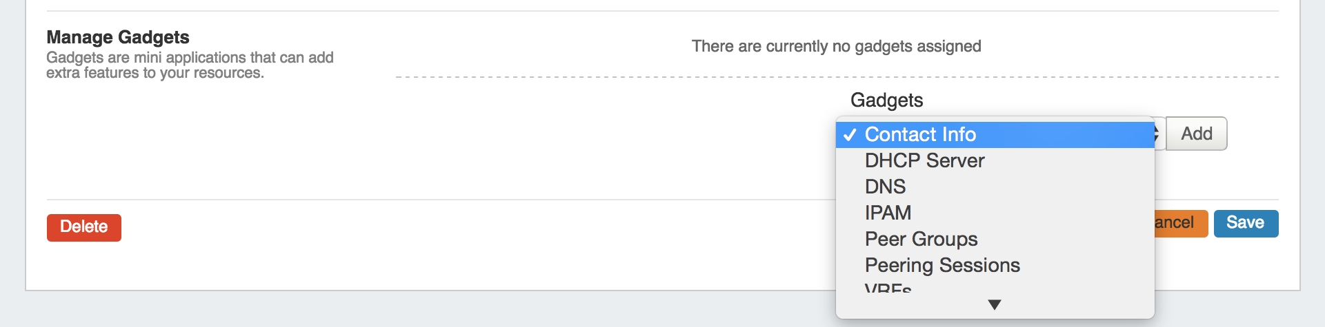 You will notice on this customization screen that you also have an area for Gadgets. Gadgets are modules of additional functionality that can be added to the UI of a given Resource. Simply select the Gadget you want to show for that section, hit "Add", then organize by dragging into the order you wish them to appear on the page. Once added to the Section, Gadgets will be visible for all Resources of that Section.