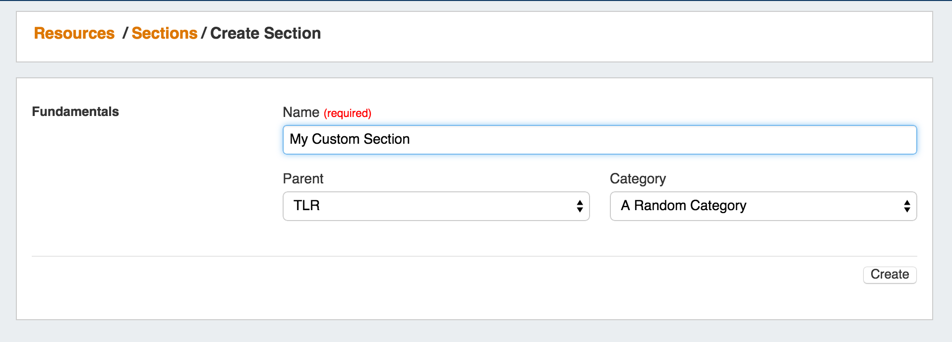 Create a new Section by specifying a Name, Parent, and Category. Then hit the "Create" button.