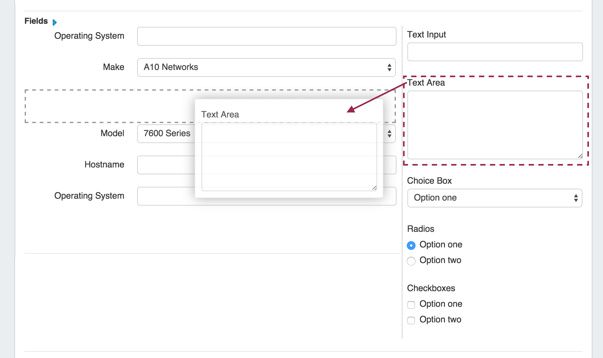 Add existing or Custom Fields for your Section. You can add new Custom Fields of different types (text input, text area, choice box, radios, checkbox) by dragging and dropping the fields as well as using any existing fields that are available. See the Customizing Fields page for more details.