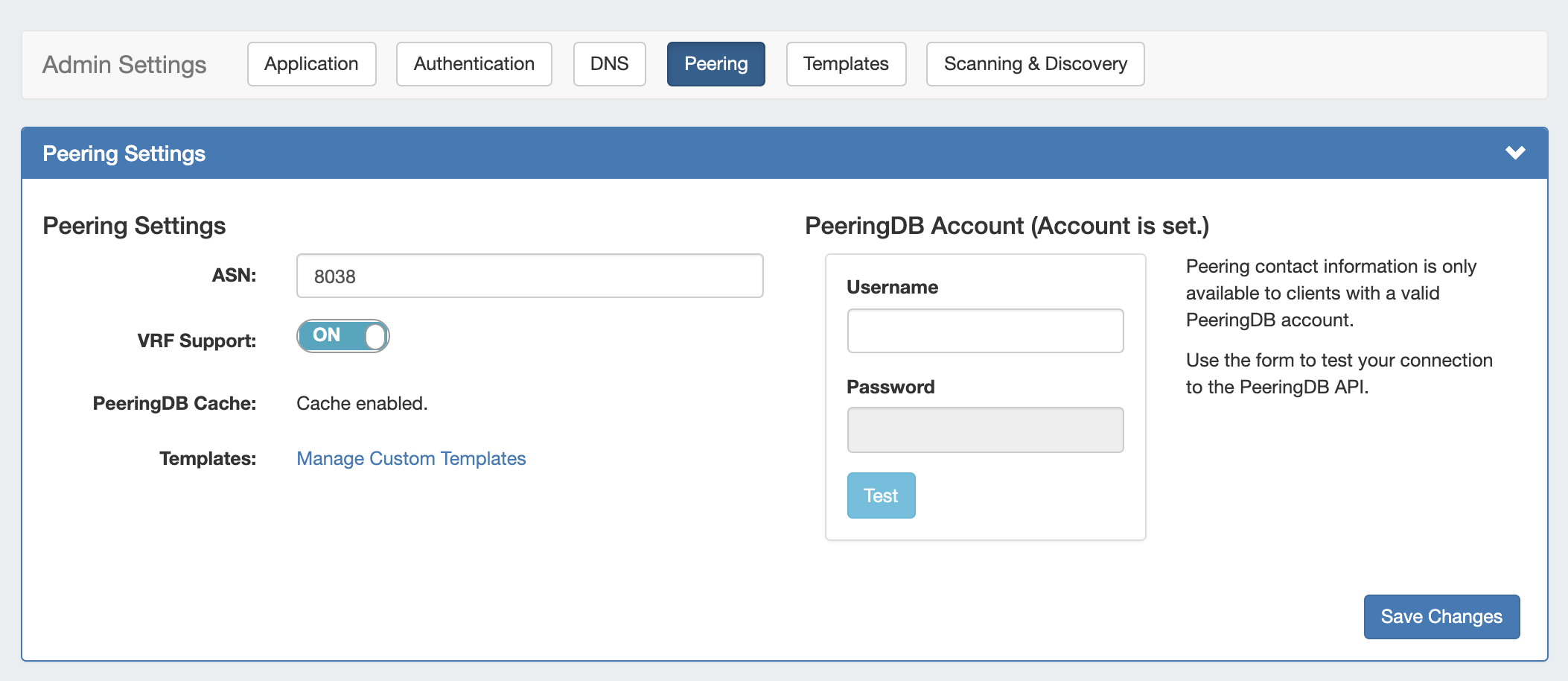 PeeringDB Account: Click the "change" link to input PeeringDB account credentials. PeeringDB account information is required to retrieve and update peering information. Enter a valid PeeringDB account Username and Password. When done, click the "Test" button to verify the account, and save.