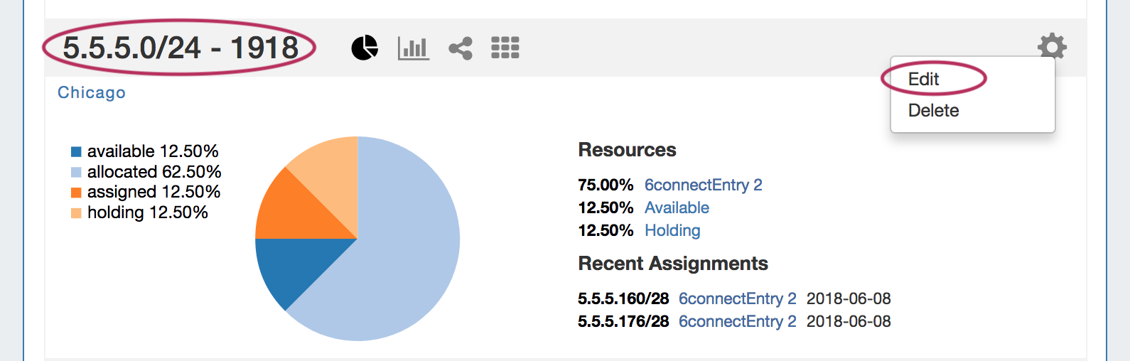 • Clicking on the CIDR header of the Aggregate Block Host Utilization module, or selecting "Edit" from the module's Gear Icon from the IPAM tab.