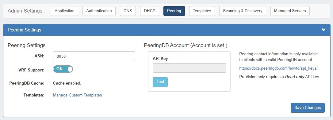 PeeringDB Account: PeeringDB account information is required to retrieve and update peering information. Enter a valid PeeringDB API Key. When done, click the "Test" button to verify the account, and save.