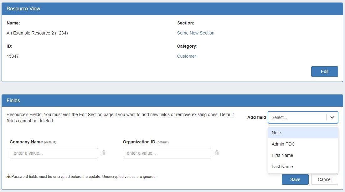 A constrained field is available to edit from the Resource List Edit Fields modal and the Resource's Fields Gadget.
