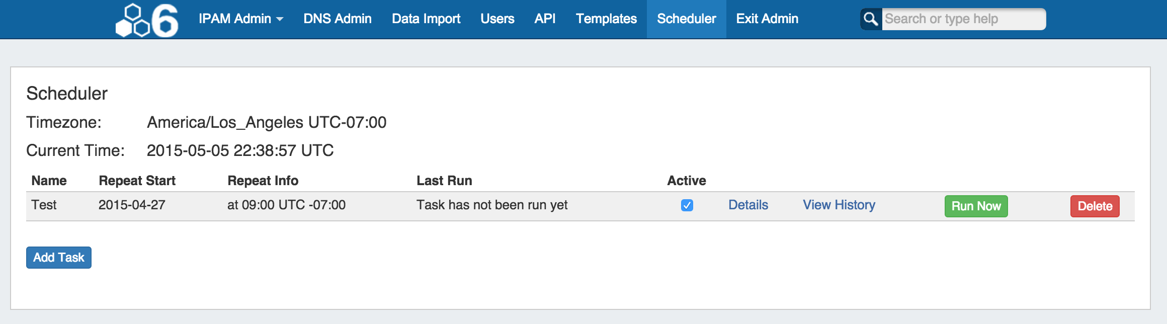 The Task Scheduler allows you to manage and schedule repeating tasks in ProVision. Three predefined tasks are available to schedule - Process Holding Tank, DNS Zone Transfer, and Backup. Note: This provided Backup task is intended to be the primary reoccurring method of backup.