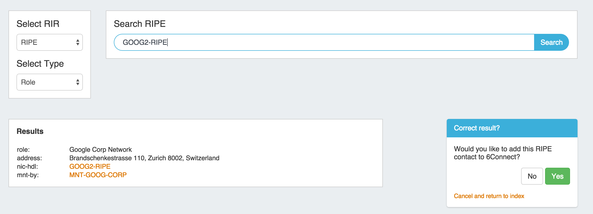 Import contacts by ARIN / RIPE Handle by clicking on the "Import from RIR" button.