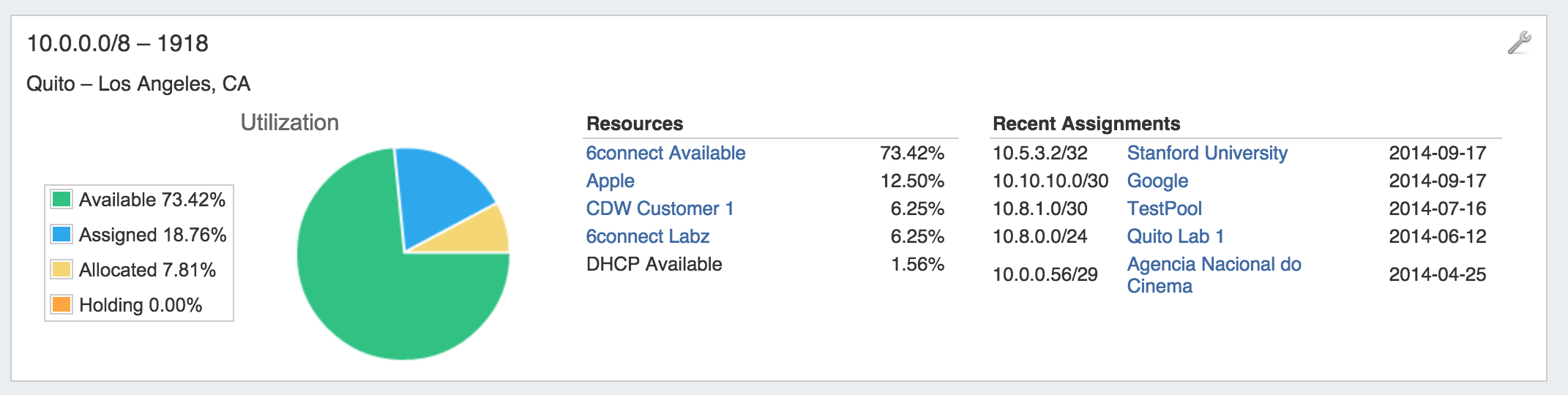 • IPAM - Top Level Aggregates have new look! They now show a chart view detailing allocations, the top five resources assigned under an aggregate, and recent assignments. The "Manage", "Template" (Merge / Clean Up), and "Delete" functions are now contained within the Action Menu (wrench icon).