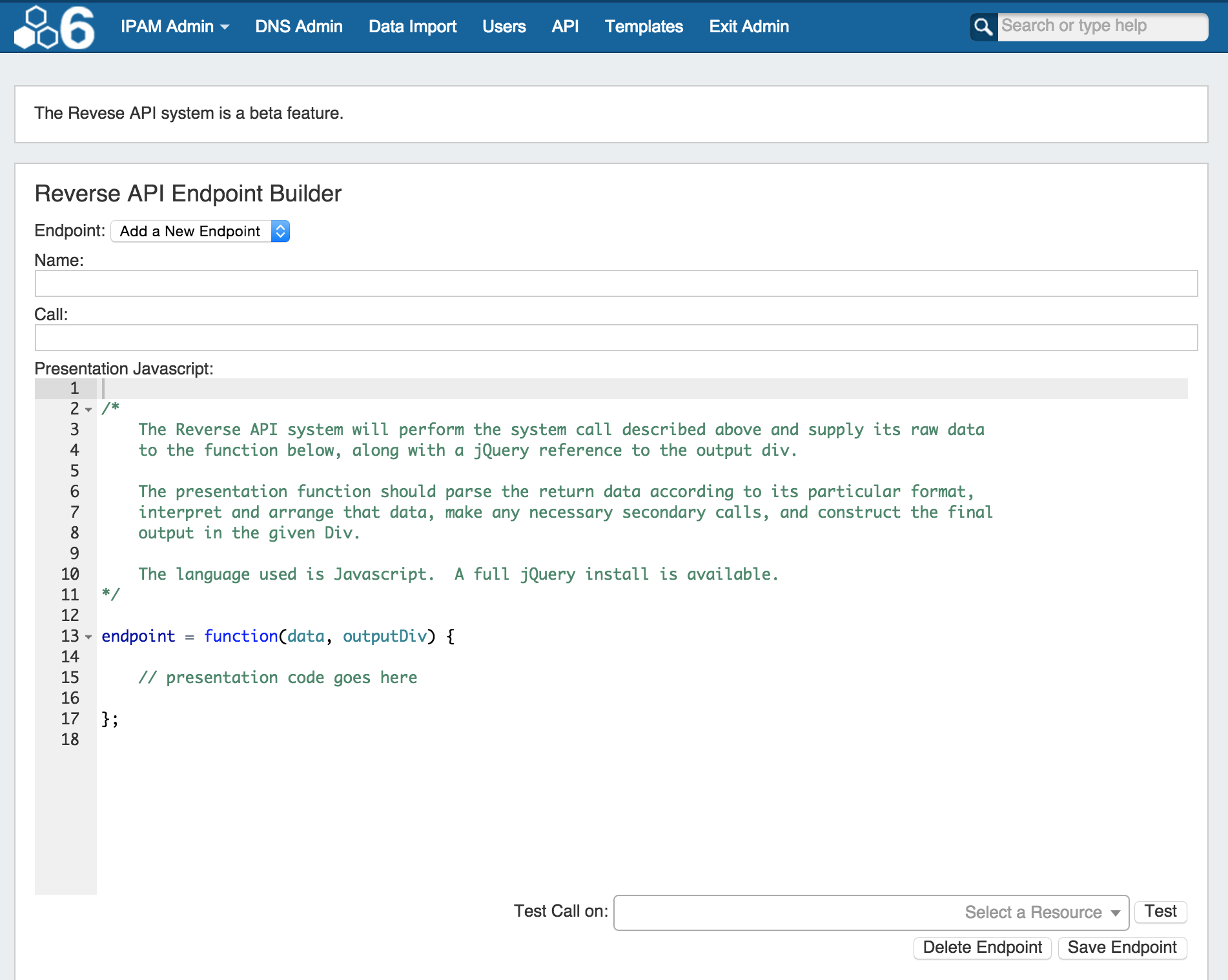 • Reverse API ProVision page:  This page allows for endpoints to be built and provides a text editor to create presentation JavaScript commands.