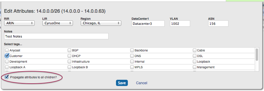 When editing attributes for parent blocks in the IPAM Manager (Action Menu -﹥ Edit), select "Propagate attributes to all children" to carry through changes to child blocks.
